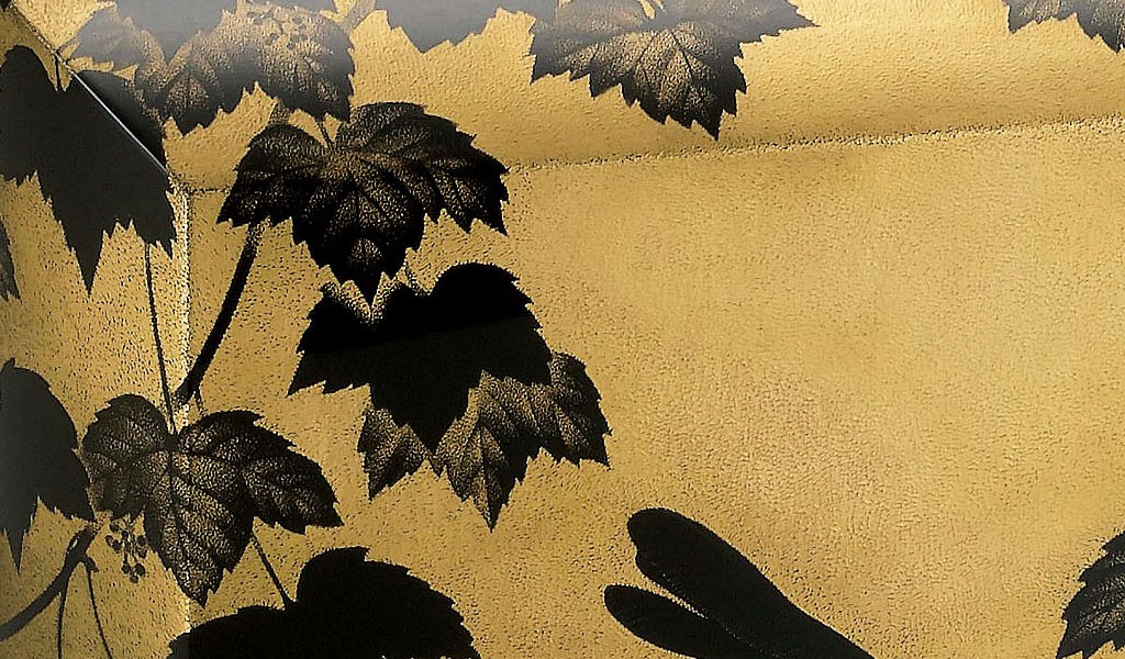 沈金とは、塗り上がった漆面に、のみや刀と呼ばれる刃物で模様を線や点で彫り、彫ったみぞに金箔や細かい金粉をすりこみ、細くて繊細な模様を表現する技法です。