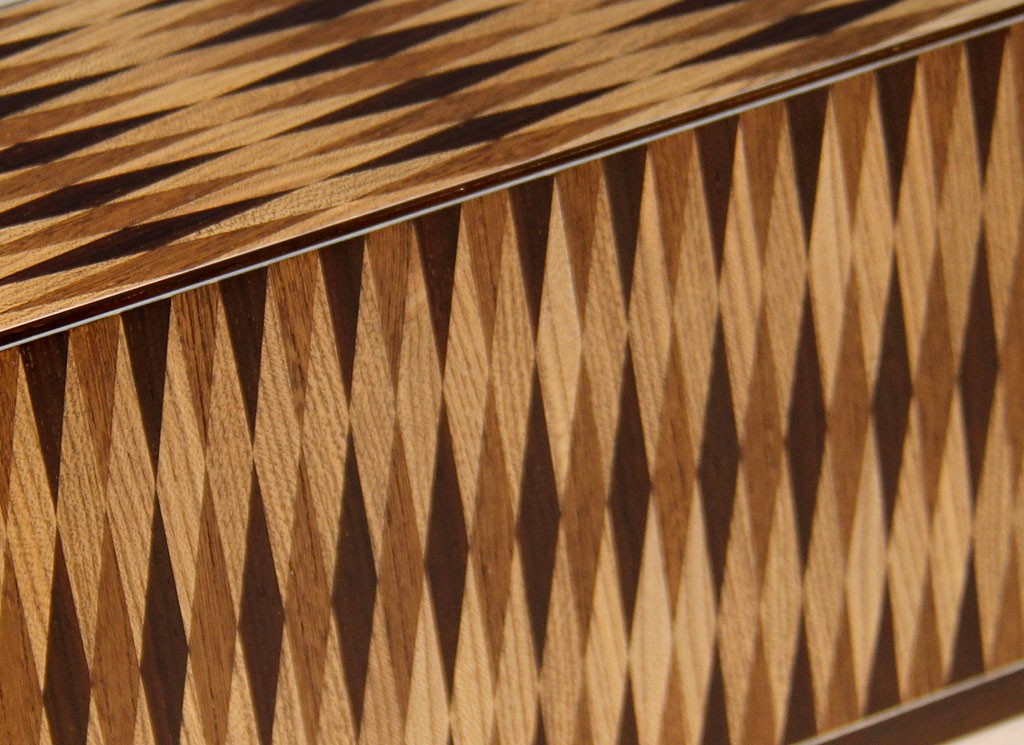 象牙による細線が、木画を引き立たせるとともに作品全体を引き締めています。