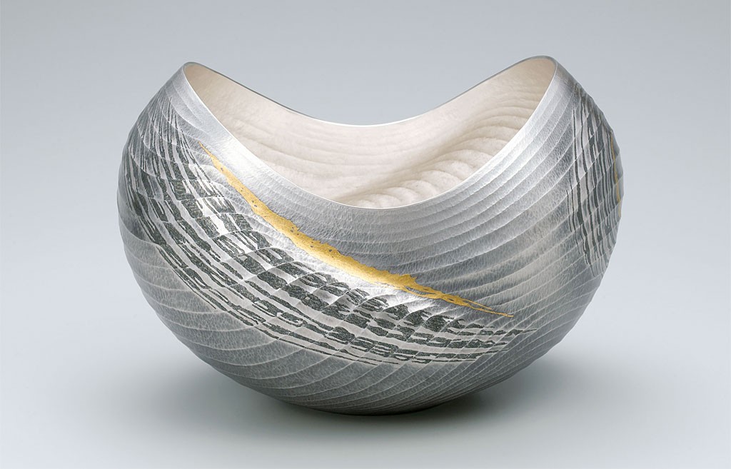 大角幸枝は、鍛金技法で成形した器に、布目象嵌を主とした彫金の伝統技法により、波、流水、雲、風など、形の無いものをモチーフとして自然の情感を表現する作風が特徴。
