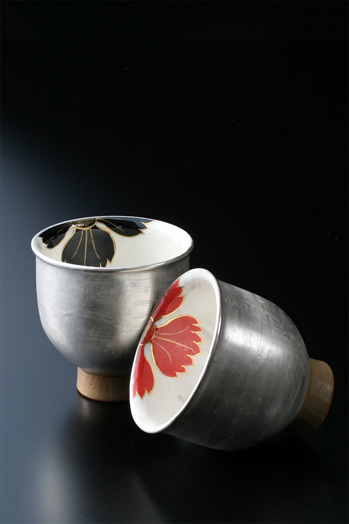 ユニークなのは、風情溢れる和風の色絵はカップの内側に描かれ、表面は本物の銀でコーティングしています。