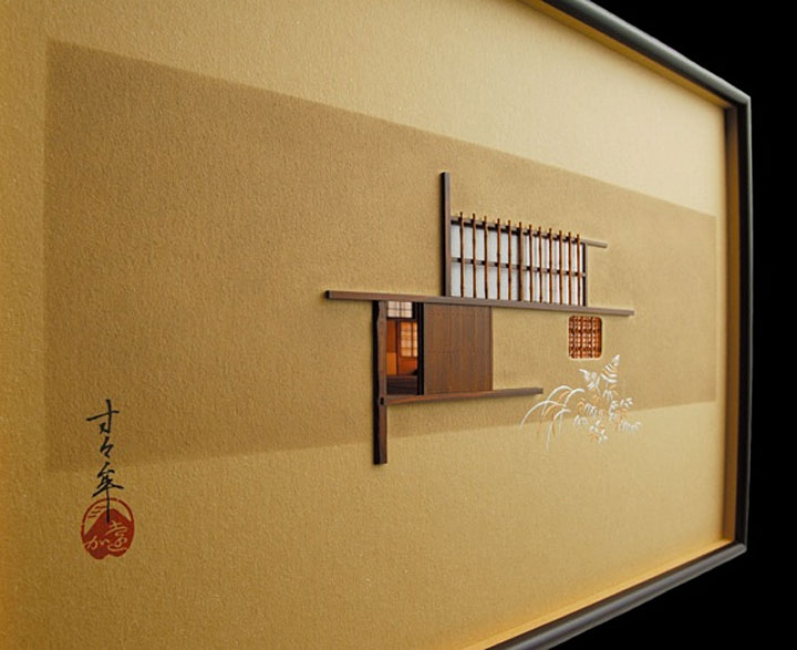 額縁の中に、平面と立体を交じり合わせた手法で、日本の伝統美を表現しています。