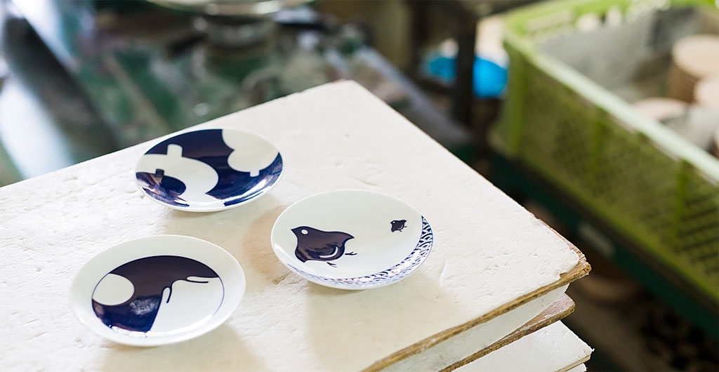 一般的な転写技法では商品に深みがでないので、手書きの雰囲気を追求できるパット印刷を採用し、従来のパット印刷の工程を見直し、染め付けの凹凸をあえて残すことで新しい表現を見いだしています。