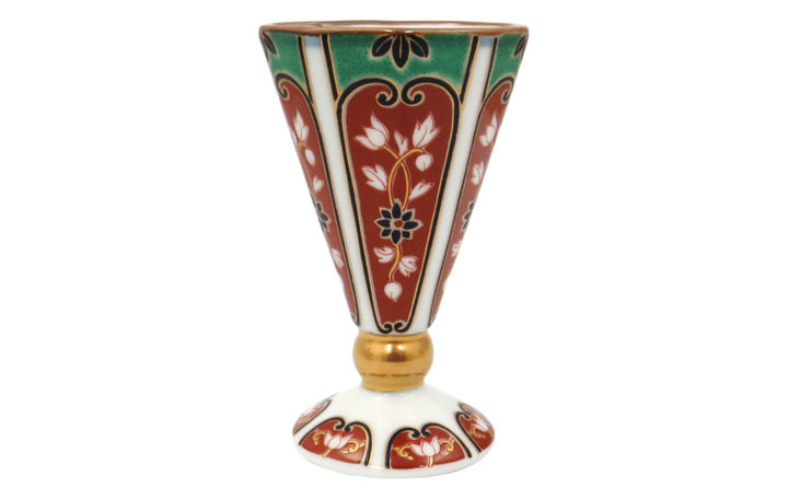 古伊万里の特徴的な技巧のひとつである、染付に赤や緑、金彩などの上絵を付けた「染錦」。鮮やかな色絵に金彩を加えた金襴手(きんらんで)様式を現代の解釈で再現。
