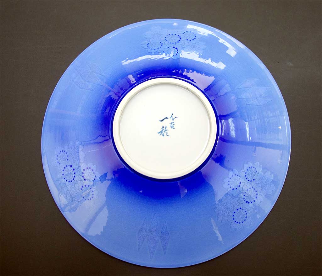 淡青で爽やかな中に深みを感じさせる澄んだブルーをベースに、釉薬の下に、桜をあしらったデザインで銀箔を貼り合せています。ブルーとシルバーの組合せがクールで月明かりのような美しさを醸し出しています。幽玄な佇まい。涼しげで現代的なスタイルとも言えます。