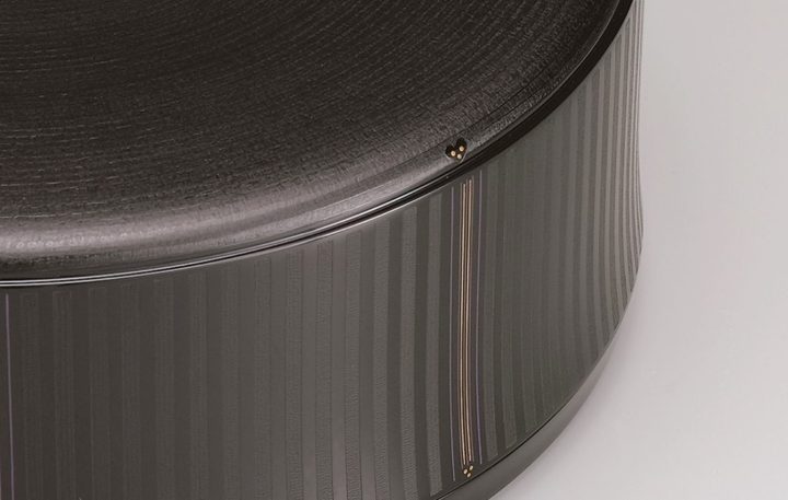 沈金を更に掘り下げ、漆器に彫った溝に伝統的な金粉のほか、独自に加工した紫や赤、緑などの色漆や貝を埋め込む「沈金象嵌(ぞうがん)」を用いてます。