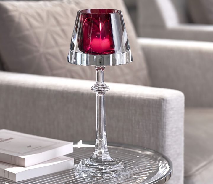 クリスタルの透明な塊と赤いカラーのコントラストが美しく、灯した火の揺らぎをいつまでも眺めていたくなる、スタルクらしい美学を感じさせるアイテム。
